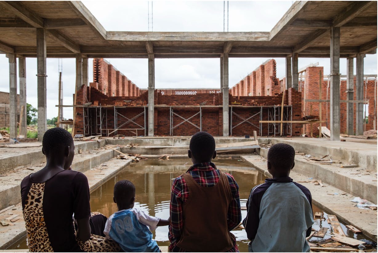 This is the Parliament of Ghosts, a project that I developed for the Manchester International Festival in 2019. We worked on it for two years, and the idea was to take the remnants of British colonial history to Manchester in order to reconsider the legacy of the Industrial Revolution and think about how to rebuild it as an architectural form. I like the idea that you can build a work as a theatre, as a stage, but I’m also interested in the constitution of labour within this space. So even when we are building, the kids in the community are using it as a swimming pool because it’s gathering water. We are using the same water to build the space. Whereas maybe in traditional architecture it’s very difficult because once a building has been built, everything is sealed off until it’s ready to open. But I think that making art should open up a space which allows for many different possibilities to happen. Here you see that even as we are building – as the bricklayers are building the space – the kids are there. It’s almost as if they are the ones who commissioned us to build this space. It’s like they’re coming from the future to give us these commissions. You realise the teachers are doing workshops with the kids in the building as we are building.