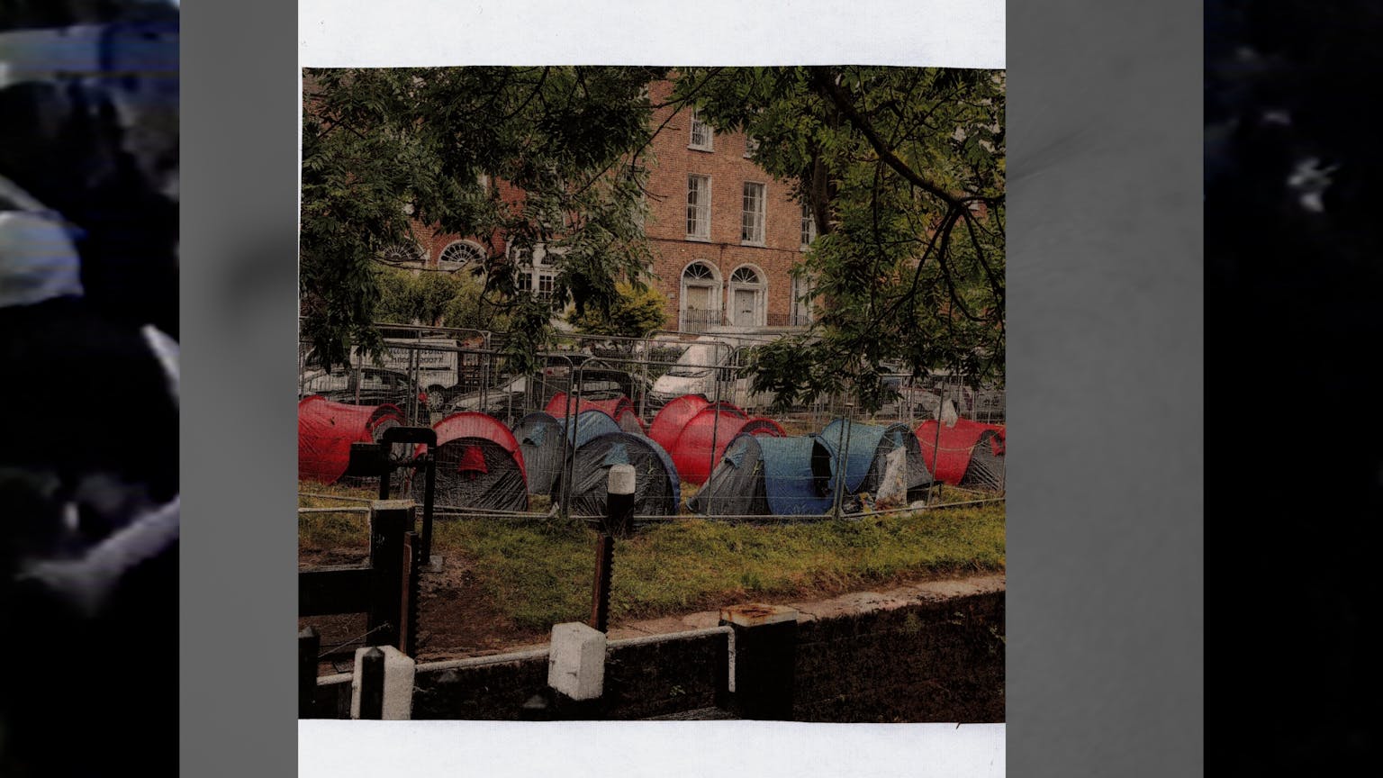 I have recently been thinking about Eoghan’s staccato editing rhythm, and the way he slaloms between 4:4 archival and 16:9 contemporary, rather than the more typical approach of expanding archival footage to occupy the same screen span as the more recent footage. I was mesmerised by the way the piece suddenly speeded up and assembled a hundred moments from a terrible year, under the umbrella of the racist slogan ‘Make Éire Great Again’. I was observing all this with more attention because I had walked over to the screening venue after I had spent a day adjusting the installation of my piece A Missing Can of Film (2025) for this edition of EVA International.3