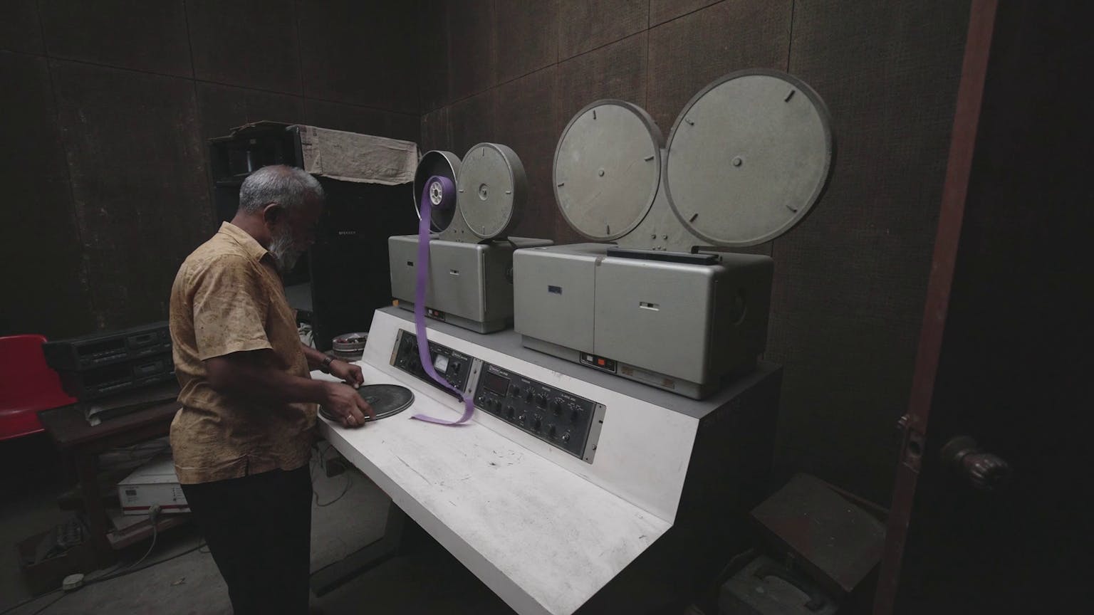 Missing Can projects my own simmering hesitation to break free of the path of quiet respect. The editing pace quickens only when it comes to Raihan’s own films, sometimes mixed as three scenes per screen, to create a split-screen homage to John Frankenheimer’s Grand Prix (1966). Then, as the jumpy rhythm of those scenes ends, we politely return to the Film Development Corporation (FDC), a largely dysfunctional, state-run film studio that is meant to be a living monument to Raihan’s work. The red text on screen questions the grand flourishes in the FDC buildings – the Ray-Raihan portrait stairway, the rusted reel-to-reel machines, and the underused sound stages. Somehow, at the end of Missing Can, the scenes from a wrecked film industry sediment into a gentle critique that may not be fully faithful to Raihan’s own desire to shatter icons and deities.